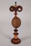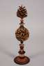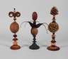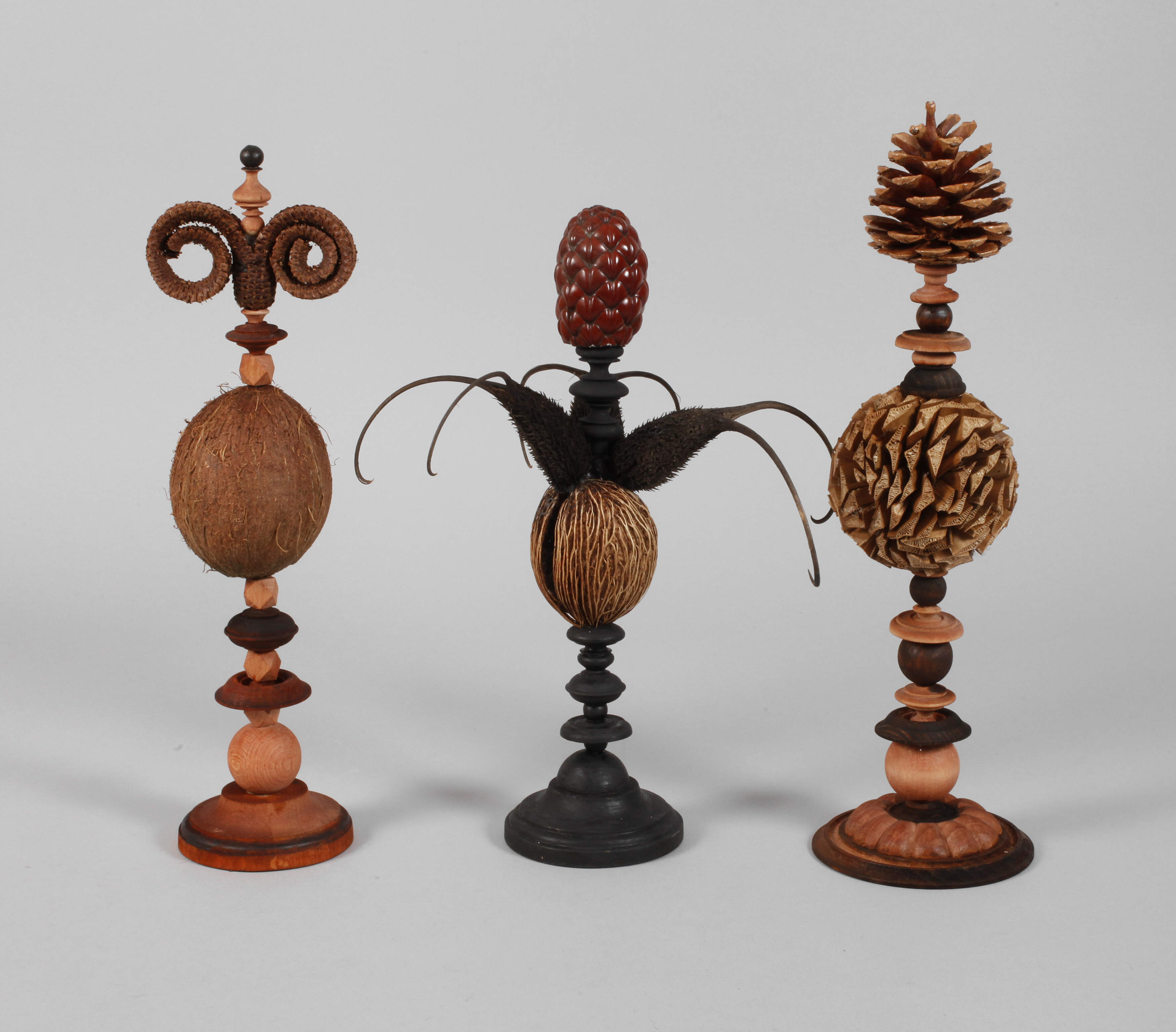 nzl., auf gedrechselten, mehrteilig gearbeiteten und farbig gefassten Balustersockeln montierte natürliche Fruchtstände als Dekorationsobjekte, H max. 42 cm.