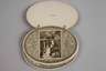 datiert 1911, Entwurf Remigius Geyling, Ausführung Wilhelm Melzer, Messingblech versilbert und vergoldet, zum Andenken an den Ball der Stadt Wien, zur Erinnerung an die Vollendung der II. Kaiser Franz Josef-Hochquellenleitung, eingelegtes Büchlein mit Fotografien rund um die Entstehungsgeschichte des Aquädukts sowie Ablauf der Tänze, Altersspuren, L 10,8 cm.