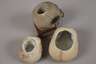 20. Jh., Biskuitporzellan, eine gemarkt Made in Japan, farbig gefasst, drei plastisch gearbeitete Totenschädel als Kerzenstände bzw. Stifthalter, winzigst bestoßen, L max. 9 cm.