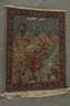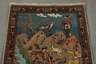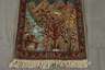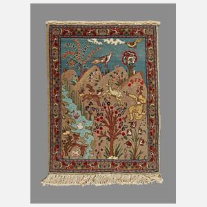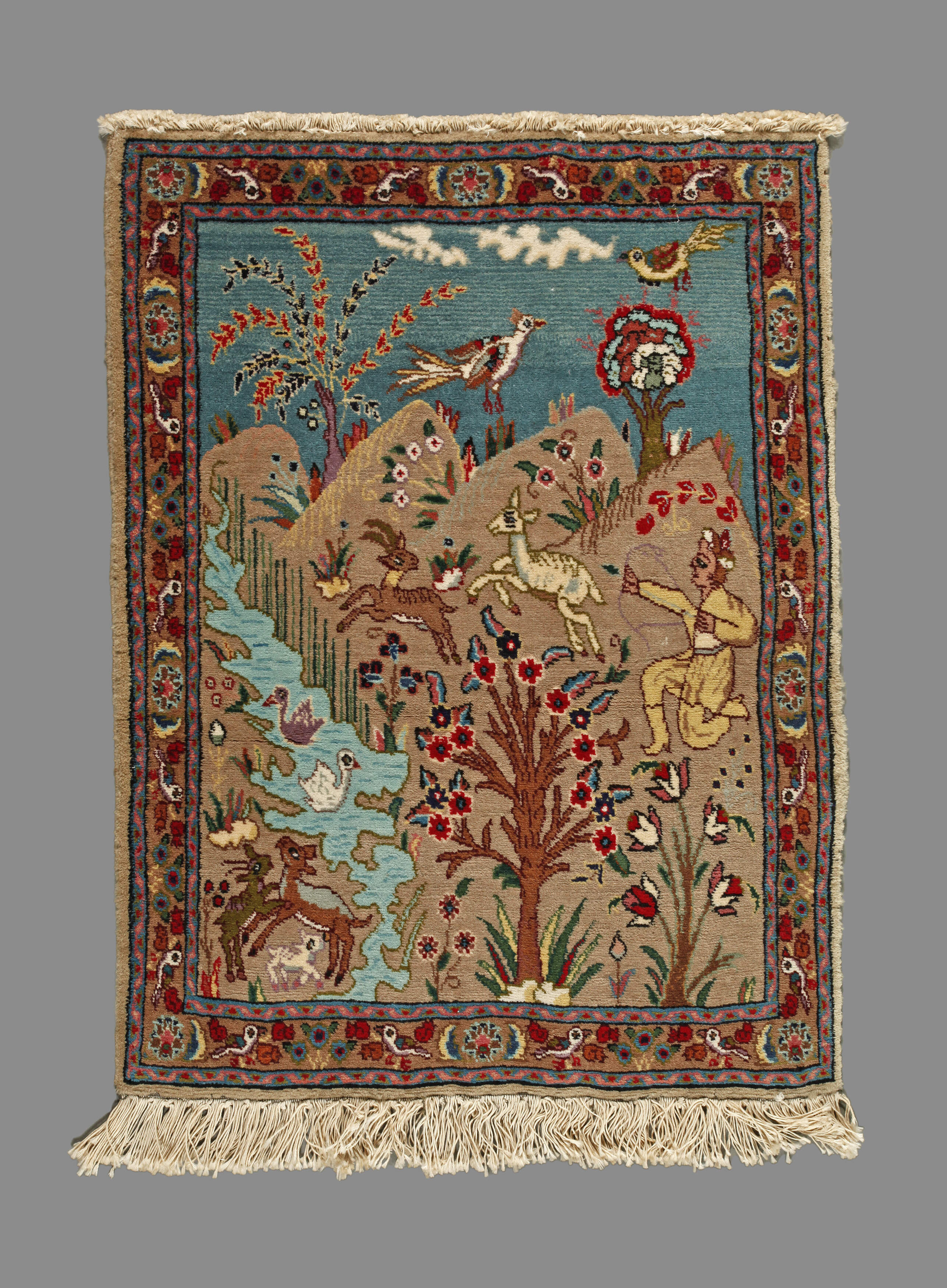 2. Hälfte 20. Jh., zentrale Landschaftsszene mit Jagdmotiv, entlang eines Flusslaufs springende Wildtiere, welche von einem Bogenschützen ins Visier genommen werden, gerahmt von Ornamentbordüre, Fransenbesatz, gute Erhaltung, Maße 80 x 55 cm.