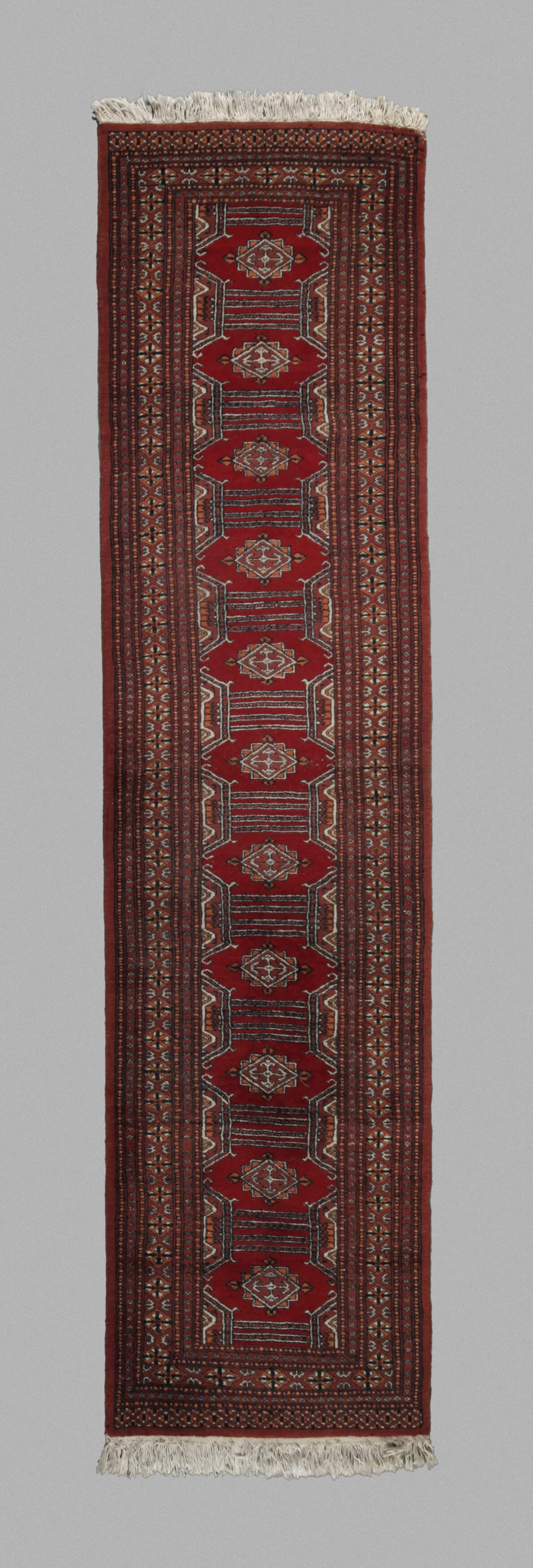 2. Hälfte 20. Jh., in Erdtönen gehaltenes Modell mit rapportierendem Rauten- und Streifendekor im Mittelfeld und umlaufenden schmalen Ornamentbändern, an den Schmalseiten mit partiellen Mottenschäden, Gebrauchsspuren, Maße 80 x 300 cm.