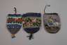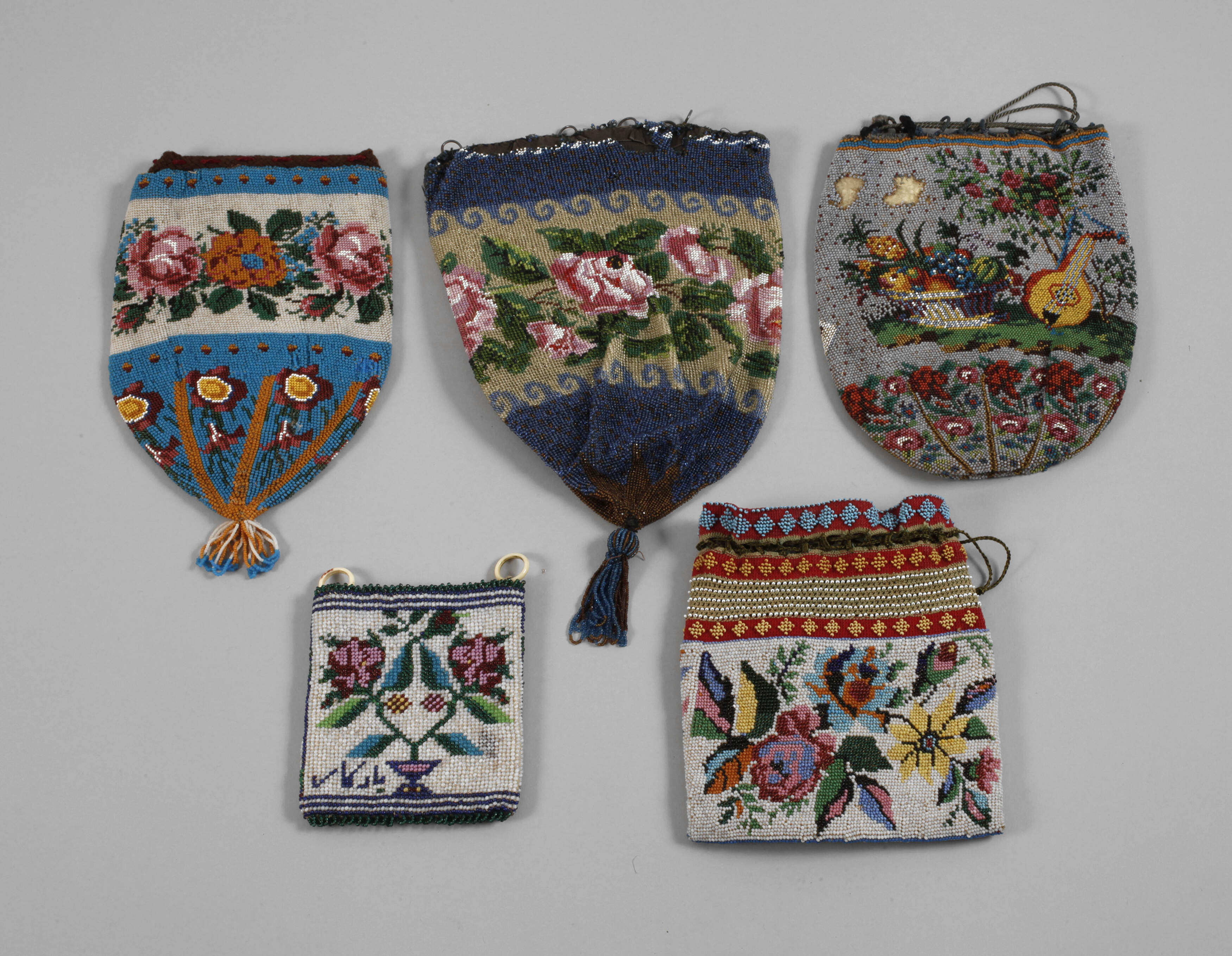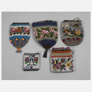 fünf Stück, meist 19. Jh., feine farbenfrohe Glasperlstickereien mit floralen und figuralen Dekoren, darunter ein Beutel mit Arrangement aus Früchtekorb, Rosenbaum und Mandoline bzw. Spielkarte, Pfeifen etc., auf der Rückseite eine Tasche mit hebräischen? Schriftzeichen und eine mit Pfauenpaar, Perlschnurhenkel und vier Quasten, alle Stoff- oder Lederfutter und meist mit Häkelabschluss, unterschiedliche Alters- und Gebrauchsspuren, tlw. Substanzverluste, L max. ohne Quaste 21 cm.