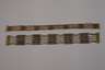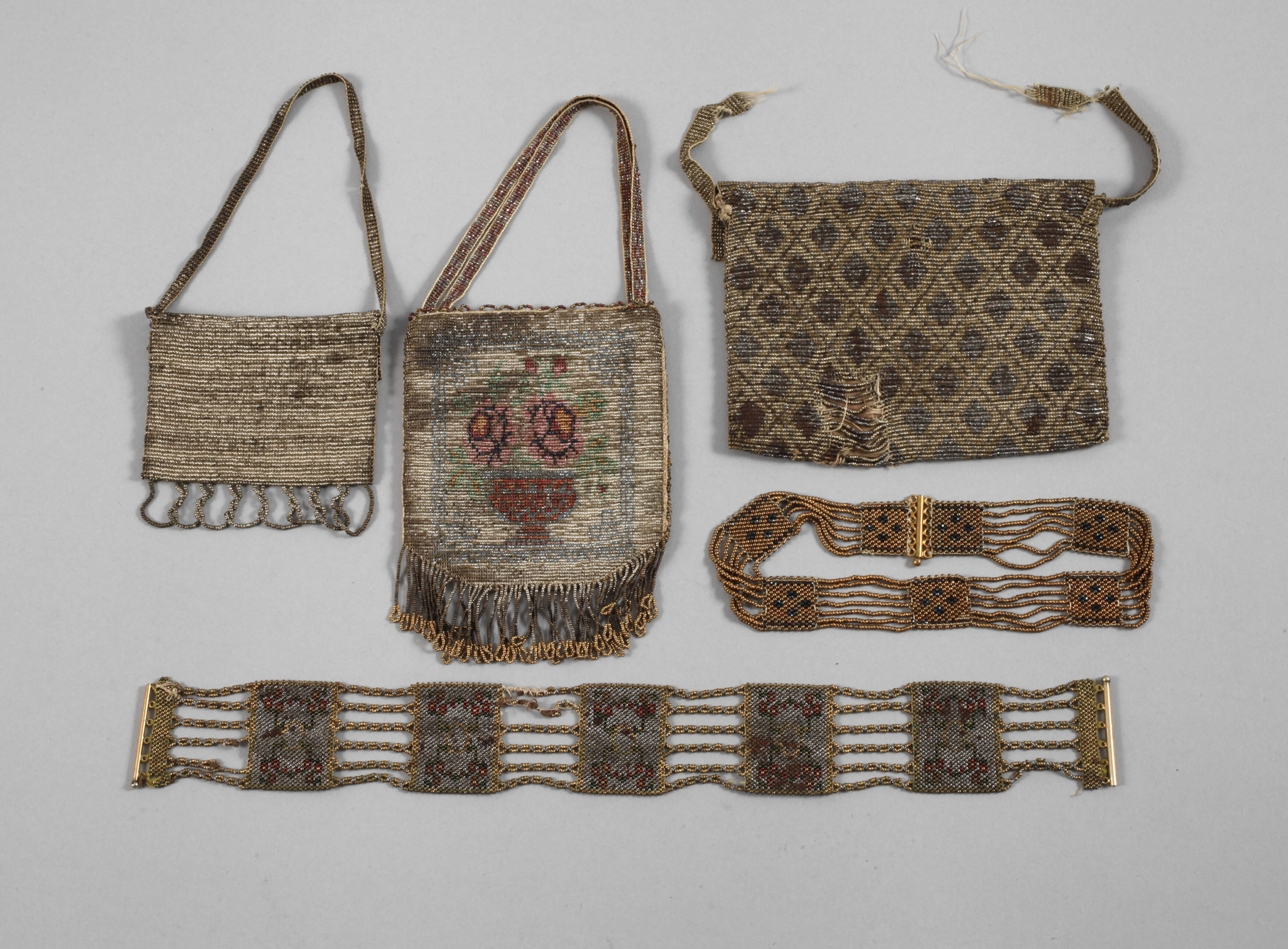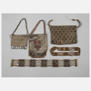 fünf Teile, 1. Hälfte 20. Jh., feine Metallperlenstickerei, mit farbigen geometrischen oder floral stilisierten Dekoren auf silber- oder goldfarbenem Grund, bestehend aus zwei Halsbändern mit Stabverschluss und drei kleinen Abendtaschen mit Bandhenkeln, Alters- und Gebrauchsspuren, Rautenmuster-Tasche mit Substanzverlust, Seidenfutter teils zerschlissen und breite Kette alt geflickt, L Kette je 33 cm, Maße Tasche max. 10 x 13 cm.