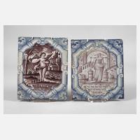 wohl Berlin, 18. Jh., Terrakotta weiß glasiert und mit kobaltblauer und manganfarbener Scharffeuerfarbe bemalt, Engel mit Herz und Spruch: "Mein Herz leidet viel Creutz und Schmertz", die andere mit Bäuerin, Milchkannen und Spruch: "Ich wil vor das Thor lauffen da werd ich meine Milch verkauffen", Alterscraquelé und kleinere Abplatzer am Rand, Wandaufhängungen aus Draht, Maße 22 x 19 cm und 23 x 18 cm.