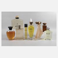 1990er Jahre, als Werbedisplay nachgebildete Dekorationsflakons originaler Kult-Düfte aus Klarglas, teils satiniert, gefüllt mit farblich abgestimmter Ersatzflüssigkeit, dabei Christian Dior Dune pour Homme, Gucci Envy, Chanel Allure, Givenchy Extra Vagance sowie Organza Indecence, Hermès Equipage, Guerlain Héritage und Rochas Femme, gute Erhaltung, H max. 48 cm.
