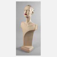 1930er Jahre, ungemarkt, Kunstguss in farbigem Spritzdekor, androgyn wirkendes Bruststück mit rot gefassten Lippen, als Display für Accessoires, gute Erhaltung, H 85 cm.