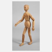 2. Hälfte 20. Jh., Nadelholz beschnitzt, mehrteilig gefertigt und montiert, bewegliche Gliederpuppe, Alters- und Gebrauchsspuren, H 40 cm.