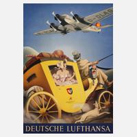 1930er Jahre, Entwurf Max Ullmann, signiert, Druckvermerk Eschebach & Schaefer Druckmuster, Farblithografie auf Papier, über eine historische Postkutsche braust eine dreimotorige Junkers Ju 52 hinweg und versetzt die Fahrgäste in Staunen, gute Erhaltung mit leichten Lagerungsspuren, Maße 84 x 58 cm.