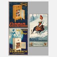 um 1920, Farblithografie auf Papier, eins gemarkt Aktiengesellschaft für Kunstdruck Niedersedlitz bei Dresden, für Eschebach Eisschränke und Schaede Waschmaschinen, leichte Erhaltungsmängel, Z 1-2, Maße max. 75 x 44 cm.