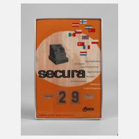 1970er Jahre, für Secura Kassensysteme Berlin, Pressspan, Weichholz, Aluminium und Kunststoff, ewiger Kalender für manuelle Einstellung von Wochentag, Datum und Monat, Alters- und Gebrauchsspuren, Maße 37 x 25 cm.