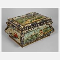 um 1915, ungemarkt, Weißblech, goldbronziert bzw. farbig lithografiert, in Barockform gestaltetes Kästchen, umlaufend verziert von sportiven Szenen und Blütendekor, leichte Alters- und Korrosionsspuren, Z 1–2, Maße 16 x 32,5 x 24,5 cm.