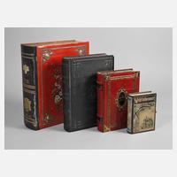 1920er Jahre, Weißblech mehrfarbig lithografiert, teils gold- bzw. silberbronziert, in Buchform gearbeitete Schatullen unterschiedlicher Größe, Z 2, L max. 35 cm.
