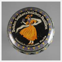 1920er Jahre, Weißblech mehrfarbig lithografiert, flache Runddose mit abnehmbarem Deckel, dieser zeigt das Portrait eines Mädchens im wehenden Kleid mit Umschrift Doktor Soldan's Veilchen-Pastillen, die Unterseite zusätzlich bezeichnet DERSO, mit ägyptisierender Figur, gerahmt von stilisierten Blütenmotiven im Stil des Art déco, gute Erhaltung mit leichten Altersspuren, Z 1, D 6,5 cm.