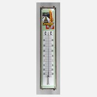 1930er Jahre, ohne Hersteller, übergroßes Thermometer, die Skala als farbig emailliertes Blechschild mit Firmenemblem und Temperaturangabe in Celsius, auf Eichenplatte montiert, funktionstüchtig, sehr guter Zustand, Z 1, Maße 107 x 23 cm.