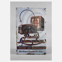 1930er Jahre, undeutlicher Herstellervermerk C. Robert Dold Offenburg-Baden sowie Bezeichnung Ferro-Email, hochrechteckiges, fast planes Schild, mehrfarbig emailliert, Verkaufsstellenhinweisschild für Radiogeräte, stärke Altersspuren, Substanzverluste, Z 2, Maße 38 x 56 cm.