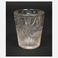 um 1690, wohl Werkstatt Hofglasschneider Winter, massives, leicht graustichiges blasiges Glas, ausgekugelter Abriss, konische Form, in feinem, poliertem und graviertem Tiefschnitt, Darstellung Amor und Apoll, seitlich begrenzt von Blüten, Gitterdekor und einem blütengeschmückten Tisch, guter altersgemäßer Zustand, H 11,5 cm.