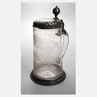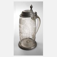 1. Hälfte 19. Jh., farbloses Glas, eingestochener Boden mit blasigem Abriss, leicht bauchig mit schauseitigem bayerischen Wappen, seitlich Rollwerk und Zweige, übergreifender Zinndeckel mit eingelegter Medaille Maria und Jesus, Glas von der Herstellung etwas blasig, sonst guter altersgemäßer Zustand ohne Beschädigungen, H 25 cm.