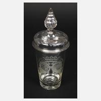 auf der Wandung datiert, farbloses, leicht schlieriges Glas mit kleinen Luftblasen, blasiger Abriss, konische Form, schauseitig bekröntes Allianzwappen, Deckel mit fein geschliffener Blattranke, angesetzter, hohl geblasener, schälgeschliffener Zapfenknauf, dieser an der Spitze etwas bestoßen, H 22 cm.