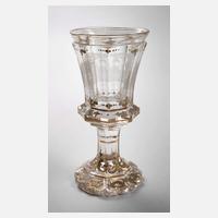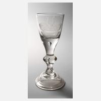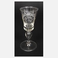 wohl Lauenstein, 18. Jh., farbloses Glas, flacher Scheibenfuß mit nach unten umgeschlagenem Rand, angesetzter bauchiger Stiel mit eingestochener Luftblase, welche in den Kuppenansatz übergeht, dieser bauchig, glockenförmige Kuppa mit Mattschliffdekor, Monogramm "FR" mit Krone im Strahlenkranz, Lippenrand mit Wellenkante, guter altersgemäßer Zustand, H 15,5 cm.