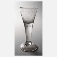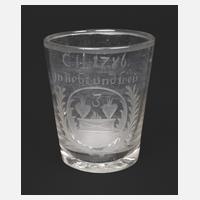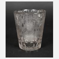 auf der Wandung datiert, farbloses, leicht graustichiges Glas mit Blasenabriss, konische Form, schauseitig zwei Herzen in angedeuteter Parklandschaft mit Nummer 3 im Blattkranz, Besitzermonogramm "C.H.", Sinnspruch: "in liebe und treu", umlaufend geschliffener Lippenrand, guter altersgemäßer Zustand, H 8 cm.