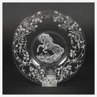 USA, Mitte 20. Jh., signiert, im Spiegel Pferdemotiv in Tiefschnitt, umlaufend, ebenfalls von unten geschliffene, feine Blütenranken mit Füllhörnern und Fackeln, guter unbeschädigter Zustand, D 20,5 cm.