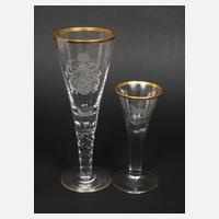um 1900, farbloses Glas, Scheibenfüße mit ausgekugeltem Abriss, massiver Schaft mit eingeschmolzenen Luftblasen, einer mit Schälschliff, Goldränder, feiner Mattschliffdekor Adelswappen mit Krone bzw. springendes Pferd mit Krone, guter unbeschädigter, altersgemäßer Zustand, H 19 und 28,5 cm.