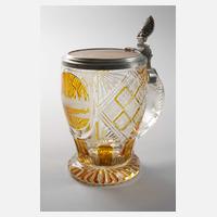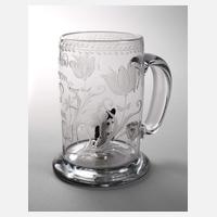 Anfang 19. Jh., farbloses Glas, eingestochener Boden, leicht gebaucht mit ausgestelltem Stand, breiter angesetzter Bandhenkel, eingeschmolzen ein stilisiertes Eichhörnchen aus Milchglas und dunkelviolettem, schwarz scheinendem Glas, feiner Mattschliffdekor mit Schriftzug: "Zum Andenken von J.P.Z. an F.C.H.", umgeben von Blütenranken, geringe Herstellungsfehler und ein kleiner Haarriss am Griffansatz, H 13,5 cm.