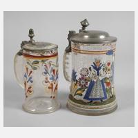 Mitte 18. Jh. und 19. Jh., farbloses Glas mit tief eingestochenem Boden, mit opaken Emaillefarben bemalt, Humpen mit Hochzeitspaar, floralem Dekor und Spruch: "Lieb du mich gleich wie ich dich so bleibt die Lieb beständiglich H.G.H. 1748", der andere mit Blattranken und umlaufenden Bändern, Zinndeckel mit Eicheldrücker, breiter Bandhenkel, dieser mit Gebrauchsspuren, der andere mit lockerem Henkel, etwas verdrückt, H 19 und 22 cm.