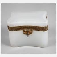 Mitte 19. Jh., milchiges Alabasterglas, ausgekugelter Abriss, gewellter Korpus mit vergoldeter Messingmontierung, Schlüssel schließt nicht, Gebrauchs- und Altersspuren, L 12,5 cm.