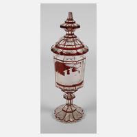 Böhmen, 19. Jh., farbloses Glas, geschliffen und rot gebeizt, schauseitig eine große Rechteckkartusche mit Waldlichtung und Rehwild, guter altersgemäßer Zustand, H 33 cm.