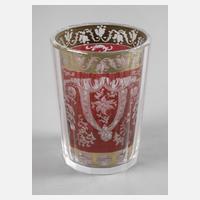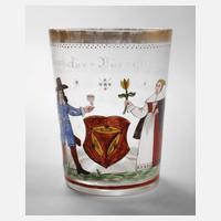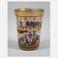 wohl Fritz Heckert Petersdorf, um 1880, leicht graustichiges, blasiges Glas mit leicht eingestochenem Boden und ebenfalls blasigem Abriss, feine polychrome, opake Emaillebemalung mit reicher Vergoldung, schauseitig Allianzwappen, Umschrift: "Marchion. Brandeburg. Lin. Franconicae. Anno 1612", Vergoldung etwas berieben, altersgemäß gute Erhaltung, H 8 cm.