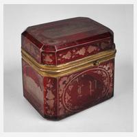 1. Hälfte 19. Jh., farbloses Glas rot gebeizt, vergoldete Messingmontierung, feine geschliffene Ansichten vom Chateau, Schloss Favorite, Trinkhalle und Conversationshalle, Besitzermonogramm L.P.?, etwas berieben, sonst normale Altersspuren, L 8 cm.