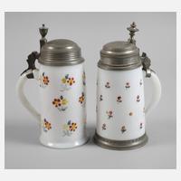 1. Hälfte 19. Jh., Milchglas mit polychromer Emaillemalerei, tief eingestochener Boden, scharnierte Zinndeckel mit umlaufenden Rillen und Bändern sowie gravierten Besitzermonogrammen, einer mit Zinnstandring, einer mit kleinem Haarriss am Griffabschluss sonst normale Gebrauchsspuren, H je 21 cm.