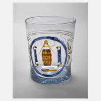 wohl 18. Jh., farbloses, leicht blaustichiges Glas, blasiger Abriss, mit bunten opaken Emaillefarben bemalt, schauseitig Zunftsymbolik, rückseitig Spruch "Vivat der Bütmer", berieben, H 10 cm.