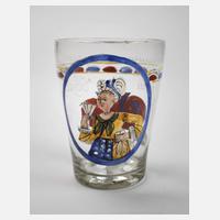 wohl 18. Jh., farbloses Glas, blasiger Abriss, mit bunten opaken Emaillefarben bemalt, schauseitig Frau mit Haube und Trinkglas, rückseitig ein florales Ornament, etwas berieben, sonst guter unbeschädigter Zustand, H 11,5 cm.
