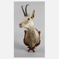 Ende 19. Jh., komplett präparierter Gamskopf mit eingesetzten Glasaugen, auf dunkel gefasster, von Eichenlaub gesäumter Holzplatte montiert, gute Erhaltung, H 65 cm.