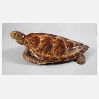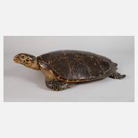 komplett präparierte Schildkröte mit eingesetzten Glasaugen, Öse zur Wandmontage an der Unterseite, leichte Erhaltungsmängel, L 49 cm. Beigegeben CITES-Papiere.