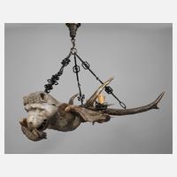 Anfang 20. Jh., Holz geschnitzt und gestuckt sowie mehrfarbig gefasst bzw. goldbronziert, an drei schmiedeeisernen Ketten abgehängte Hirschgeweihstangen im Stile eines Lüsterweibchen mit Fabelwesen verziert, vierflammig elektrifiziert, H ca. 60 cm, L ca. 100 cm.