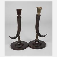 Ende 19. Jh., gedrechselte Basen aus dunkel gefasstem Laubholz, Schaft und Tülle jeweils aus Gamshorn gestaltet, minimale Altersspuren, kleinste Substanzverluste, H je ca. 26 cm.