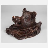 19. Jh., Nussbaum beschnitzt und dunkel gefasst, teils scharniert, plastisch gestaltetes Haupt eines Ebers, flankiert von Eichenlaub, innenliegendes Tintenfass aus Klarglas, wohl später ergänzt, min. Substanzverluste, H 22 cm.