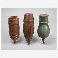 Tirol, 18./19. Jh., Laub- bzw. Nadelholz beschnitzt und teils farbig gefasst, massive Wandbehälter in unterschiedlichen Dessins, Substanzverluste, Reste alten Wurmbefalls, H max. 30 cm.
