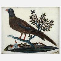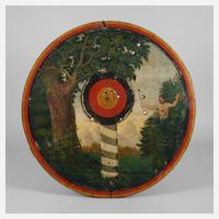 wohl 1. Hälfte 20. Jh., rückseitig undeutlich handschriftlich annotiert und mit Angabe 25.7.1980, Front monogrammiert ...H, Nadelholz farbig gefasst, in Schwarz-Rot-Gold gefasste Zielscheibe mit Landschafts- und Figurenmotiv, mit Gebrauchsspuren und Treffern, kleinere Substanzverluste im Randbereich, D 63 cm.