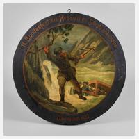 datiert und mit Ortsangabe Darmstadt 1932, bezeichnet 16. Bundesfest des Hessischen Schützenbundes, signiert Gust. Grosch 32 Cronberg a.T., Weichholz farbig gefasst, zentrale Darstellung, die den Freiheitskämpfer Wilhelm Tell am Ufer des Vierwaldstättersees beim Sprung auf die Tellsplatte zeigt, guter altersgemäßer Zustand mit Gebrauchsspuren und Treffern, D 86 cm.