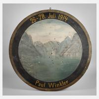 datiert 26.–28. Juli 1914 sowie mit Besitzerangabe Paul Winkler, rückseitig betitelt „Der Königssee“ und weiterhin etwas undeutlich bezeichnet gem. v. E. Märadus, Rabenstein, Weichholz farbig gefasst, zentrale Darstellung der Berchtesgadener Alpen, guter altersgemäßer Zustand mit Gebrauchsspuren und Treffern, D 86 cm.