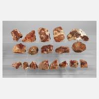 bestehend aus 21 angeschliffenen und drei unbehandelten Achaten aus St. Egidien, D max. ca. 15 cm, ein Anschliff geklebt und sieben weiteren Mineralanschliffen (vorwiegend Quarze), L max. ca. 24 cm.