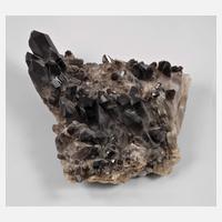dekorative Stufe mit gut ausgebildeten, glänzenden Rauchquarzkristallen, vermutlich bestrahlt, um die Färbung zu intensivieren, Länge der Kristalle max. ca. 10 cm, nur minimale Beschädigungen, Maße der Stufe ca. 25 x 25 x 10 cm.
