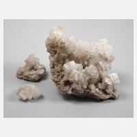 drei dekorative, gut ausgebildete Stufen mit würfeligem Halit (Steinsalz), Kristalle mit der für den Fundort typischen partiellen Trübung, Kantenlänge der Kristalle max. 29 mm, Fund von 1985 in Bernburg/Sachsen-Anhalt, Maße der Stufen Max. ca. 25 x 18 x 13 cm.
