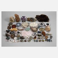 ca. 60 Stück, vorhanden sind unter anderem: Amethyst/Brasilien, gediegen Kupfer/USA, Citrin/Brasilien, Azurit, Malachit, Tigerauge, Turmalin, Aquamarin, Achate, Pyrite, Sandrosen, Rosenquarz, Granat, Amazonit, Gips, Pyritrose, Antimonit, Titanit, versteinertes Holz, Septarie, Ammonit, Muskovit, Labradorit und synthetische Korundbirnen nach Verneuil, Länge der Mineralien max. ca. 28 cm.