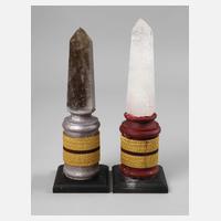 nzl., dekorative Aufsteller aus gedrechseltem und farbig gefasstem Holz mit Ornamentmanschette sowie aufgesetztem, facettiertem Rauchquarz bzw. Bergkristall, auf ebonisierten Basen montiert, H 28 und 29 cm.