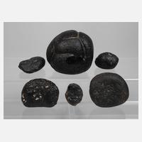 bestehend aus Tektit, Thailand, ca. 53 x 45 x 20 mm, G ca. 63,8 g; Moldavit, Milikovice/Tschechien, ca. 35 x 26 x 15 mm, G ca. 14,9 g; ungewöhnlich kugeliger Tektit mit dekorativer Rissbildung, ca. 65 x 67 x 62 mm, G ca. 370,3 g sowie drei Tektite unbestimmten Fundortes von max. 60 x 55 x 17 mm, G gesamt ca. 144,2 g.